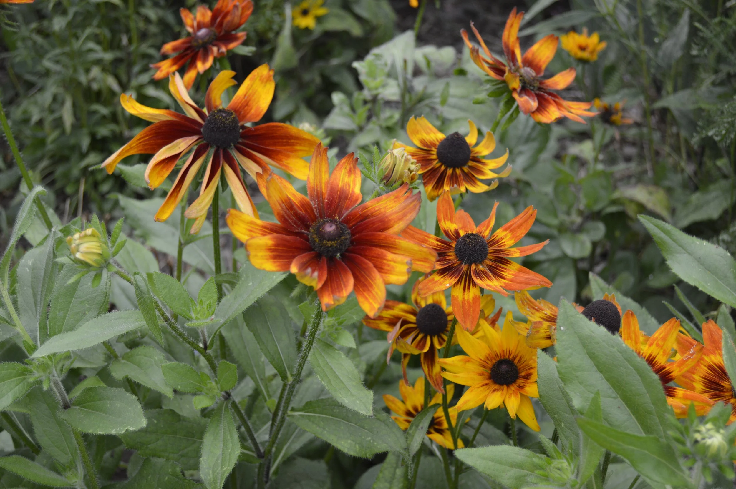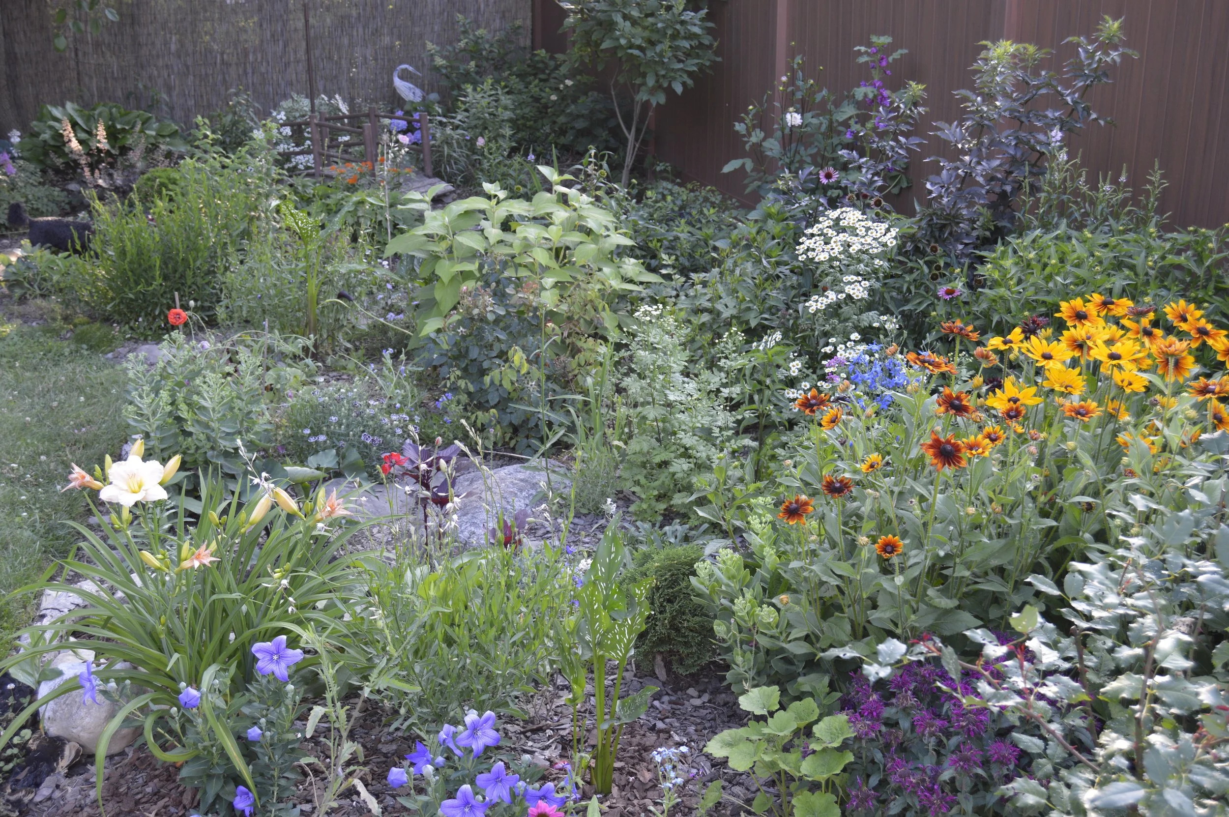Not that you want the garden to get weedy and overtaken by thugs, but there are some plants that I welcome to spread their progeny. Some of the self-seeders in this picture are: Feverfew, Rudbeckia, Hollyhock, and Amaranth.